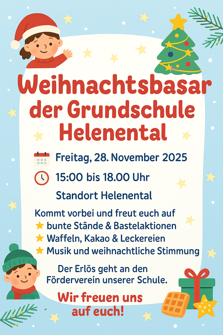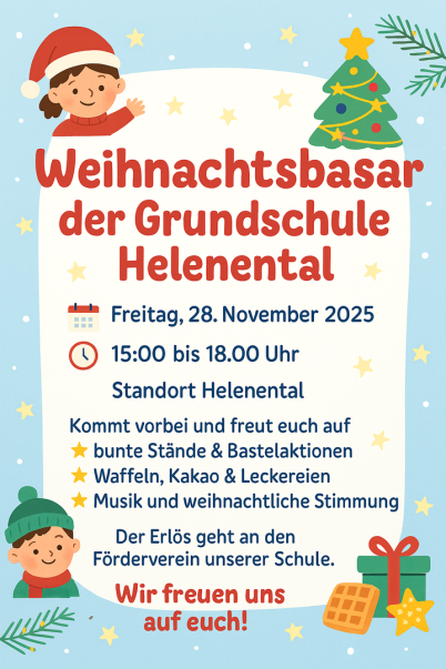 28.11.2025 Weihnachtsbasar an der Grundschule Helenental von 15.00 - 18.00 Uhr
