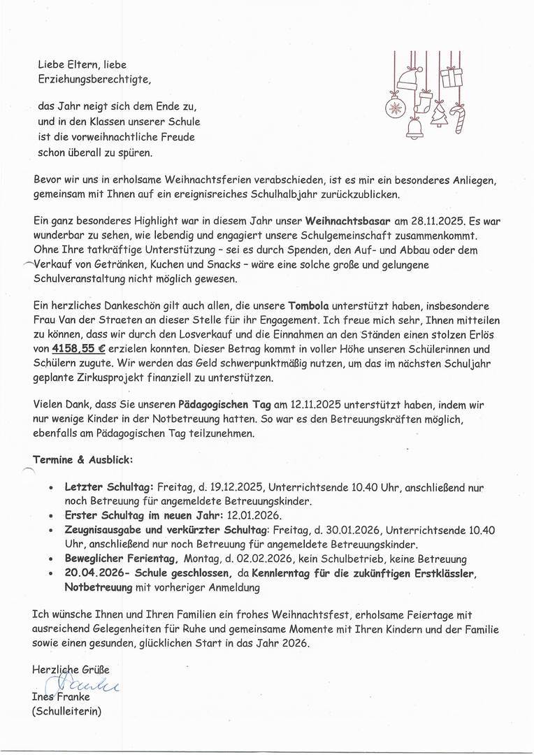 Der Weihnachtsbasar bescherte der Schulgemeinschaft einen harmonischen und stimmungsvollen Weihnachtsnachmittag und stimmte auf die bevorstehende Weihnachtszeit ein. Der Erlös des Basars kommt dem Förderverein der Schule zugute, der Projekte und Aktivitäten rund um das Schulleben unterstützt.