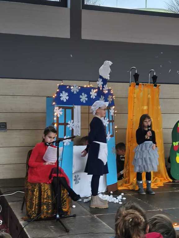Den musikalischen Auftakt gestaltete der Schulchor unter der Leitung von Frau Pfeil-Emde. Mit dem Lied „Macht euch bereit (Fröhliche Weihnacht)“ eröffneten die Kinder den Nachmittag. Im Anschluss führte die Klasse 3a mit ihrer Lehrerin Frau Trefz das Märchen „Frau Holle“ auf. Eine sorgfältig gestaltete Bühne mit selbstgebauten Kulissen und stimmungsvollen Lichteffekten ließ das Stück lebendig wirken und wurde mit viel Applaus belohnt.